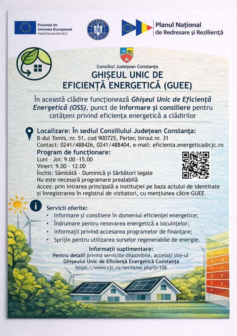18/03/2026 @ Toată ziua – Consiliul Județean Constanța informează cetățenii că în sediul instituției funcționează Ghișeul Unic de Eficiență Energetică (GUEE), punct de informare și consiliere privind eficiența energetică a clădirilor.Serviciile oferite includ: informare, îndrumare pentru renovarea energetică a locuințelor, accesarea programelor de finanțare și sprijin pentru utilizarea surselor regenerabile de energie.Program de lucru:Luni–Joi: 09:00–15:00Vineri: 09:00–12:00Accesul se face pe baza …